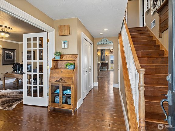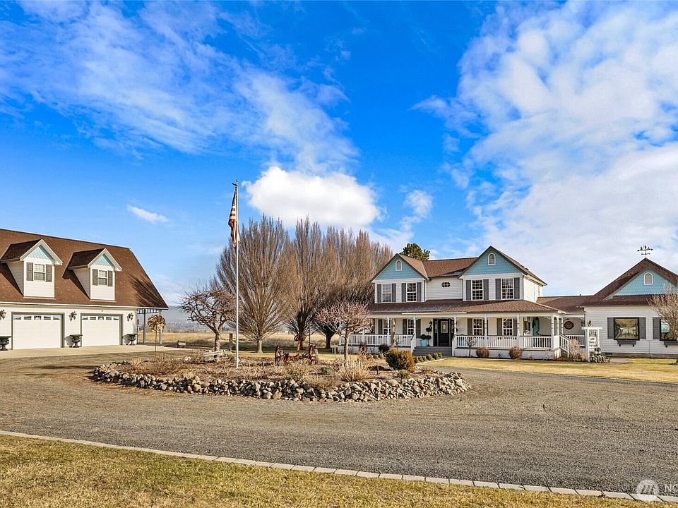 Custom legacy home on 5 irrigated acres in Manastash Ridge, just outside Ellensburg. This 4,157 sq ft high-end residence offers freedom with no HOA or CCRs, KRD irrigation, and room to live, work, and grow. The home features 4 bedrooms and 2.75 bathrooms, with custom millwork, hand-scraped hardwoods, vaulted ceilings, and abundant natural light. The chef’s kitchen includes a 6-burner gas range, commercial fridge, double ovens, granite countertops, oversized island, butler’s pantry, and custom cabinetry. Living spaces include a great room with gas fireplace and an office with electric fireplace. A large bonus room with built-ins can serve as a recreation room, home business, or educational space. The primary suite features a spa-like bath with heated tile floors and walk-in shower. 13 custom California Closets provide exceptional organization. The two-story detached garage/shop offers 1,500 sq ft with epoxy floors and built-in cabinetry, plus 890 finished sq ft upstairs. A 70-panel, 15kW solar array adds efficiency. The fenced yard features underground sprinklers, mature landscaping, greenhouse, wrap-around porch, covered patios, multiple outbuildings, and a brand-new Bullfrog hot tub/spa, all with privacy and mountain views.