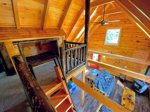 Escape to this charming log cabin retreat in a beautiful park-like setting, your slice of paradise surrounded by 32 acres of pristine wilderness flanked by the protected Ammonoosuc River and the White Mountain National Forest. This fairy-tale cabin offers everything you need for a memorable getaway, including a hot tub, on-site hiking trails, and seasonal amenities like a volleyball court and a 25x45 ice skating rink, available when weather permits. Kids love the treehouse-like loft, accessed by a ladder, with a queen bed and roofed cubbies for kids and twinkly lights to evoke the fireflies that dot the property in the early summer. In the winter, you will feel like you're in a Hallmark movie. All this, in an amazing location, just two minutes from NH's favorite ski area, Bretton Woods, and the majestic Omni Mount Washington Resort. Blending rustic charm with modern conveniences, this cabin features a traditional log design with unique touches like hand-carved bear accents and a cozy soapstone wood stove, along with AC and heating provided by energy-efficient mini splits in each space. For peace of mind, a full-house generator ensures your stay remains comfortable, even in unexpected weather. Solar panels make this home green too. For your comfort, the living room futons have been replaced with a cozy sectional, perfect for snuggling up watching TV or the flames dancing in the wood stove. And there's more, a full bathroom with heated floors and a washer and dryer is expected to be completed by Spring 2025. A shared Tesla charger is available nearby. Dog-friendly with an abundance of outdoor space to explore. Access to Moose Lodge and Cabins amenities, including trails, beach, and natural wonders. Option to purchase pool and gym passes at the Mountain View Grand Resort and Spa, subject to availability. Earn Bretton Woods Vacations Reward Points with each stay. Rates get cheaper the longer you stay, so treat yourself to a longer stay and save. Step outside to enjoy a stunning masonry fire pit, hot tub, private beach shared only with other guests of the Moose Lodge and Cabins, and breathtaking landscapes perfect for wildlife viewing. With walking trails leading to wetlands, ponds, and riverfront paths, you'll find plenty to explore right on the property. The Ammonoosuc River, known for its excellent fishing, also offers a refreshing spot for swimming and tubing in the summer. Keep an eye out for local wildlife, including moose, eagles, and the occasional bear, and enjoy one of the best spots in New England for moose sightings just a short walk from the cabin. Lower Falls, one of the area's favorite swimming holes, is also an easy walk from the house. From this central location, the best of the White Mountains is at your doorstep. Ski Bretton Woods, just 1 mile away, or explore the iconic Mount Washington Hotel, the Cog Railway, and an array of nearby ski resorts, including Cannon, Wildcat, and Attitash. Beyond skiing, you'll find countless activities, including hiking, golfing, fishing, waterfalls, and family attractions like Santa's Village, Storyland, and the Lost River Gorge. Check-in is at 4 PM and check-out is at 11 AM. Early check-ins and late check-outs are subject to availability. A digital guidebook is provided before arrival. Lock codes are provided 1-hour before check-in subject to signing the rental agreement. All interactions are virtual, but our office team and ground crew are available for assistance. The total number of guests at the property must not exceed the number listed in the booking. A nightly extra guest fee may apply for guests above the standard occupancy up to the maximum number of allowable guests. Dogs are allowed, maximum of 5 dogs, any other types of animals require approval. All pets including Emotional Support Animals are subject to a pet fee per pet. Dogs should not be left unattended in units if there is potential for them to damage the property. Respectful noise levels are required, with quiet hours from 10 PM to 8 AM. Your unit will be stocked with a starter set of consumables including toilet paper, paper towels, a sponge, trash bags, dish soap, dishwasher pods, laundry pods, and coffee filters. Additional supplies should be provided by the guest. A whole house generator will keep the lights on even in the event of an outage. There is whole-house AC provided by 3 mini split units. There is a wood stove on the main level. Firewood is not provided but can be purchased and conveniently delivered to your rental or purchased from other local vendors. This unit has a propane grill and propane is supplied. This unit has a fire pit. No unauthorized fires are allowed. State and local laws regulate the use of fire pits, grills, other open flames, and fireworks. Only use provided grills and fireplaces. Permits are required to use fire pits in NH. Parking is limited to 4 cars. Trailers are allowed. Each property has parking limits based on capacity and or potential rules of the Homeowner's Association. Guests must abide by these limitations to protect the physical property and the space of neighbors. Additional vehicles must be parked in specified overflow parking areas. Trailers or RVs may not be parked at any property without permission. Excess vehicles may be towed. Access from parking to the front door requires 2 small steps. Trash and recycling dumpsters are on-site. This home does not have a dishwasher. Ice skating rink use is subject to weather and ice conditions. This is an amenity offered at no cost, no refunds are given if the rink cannot be used for any reason. Rural homes may encounter pests like bears, mice, lady beetles, and wasps. To minimize this, trash should not be left outside. We actively manage these situations while prioritizing environmentally friendly methods and limiting the use of chemicals. High-speed Wi-Fi, AC, and Roku-enabled TV with streaming services are available for your convenience. Digital guidebooks and local insights are at yo