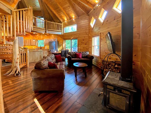 Escape to this remarkable yurt-inspired retreat on 32 acres of pristine land along the Ammonoosuc River, just 1 mile from the ski lifts at Bretton Woods. Whether you're seeking winter adventures or summer relaxation, this property offers an unmatched experience year-round. The home features a stunning spiral staircase carved around a preserved tree with exposed roots. Upstairs, the master suite boasts a king bed, an open walk-in closet, and a rustic bathroom with a stone shower. A cozy loft area offers an additional full bed. The main level includes two more bedrooms, a second full bathroom, and an open-concept kitchen, dining, and living area. The kitchen is equipped with stainless steel appliances, wood countertops, a Keurig, and an Instapot. Relax in the living room with the soapstone wood stove and a variety of entertainment options including Hulu, Netflix, Disney+, Amazon Prime, and more. Step outside to the spacious deck with a grill and dining set-up, or gather around the fire pit on the stone patio. A shared Tesla charger is available nearby. Option to purchase pool and gym passes at the Mountain View Grand Resort and Spa, subject to availability. This home is part of the Moose Lodge and Cabins community, surrounded by the White Mountain National Forest and the Ammonoosuc River. The property's breathtaking landscapes are perfect for wildlife enthusiasts, offering walking trails that meander through wetlands, ponds, and serene riverfront paths. The Ammonoosuc River, renowned for its excellent fishing, also provides refreshing spots for swimming and tubing during the summer months. Lower Falls, one of the area's favorite swimming holes, is also an easy walk from the house. Check-in is at 4 PM and check-out is at 11 AM. Early check-ins and late check-outs are subject to availability. Dogs are allowed with a maximum of 5 dogs, and any other types of animals require approval. All pets except for service animals are subject to a pet fee per pet. Dogs should not be left unattended in units if there is potential for them to damage the property. Quiet hours are from 10 PM to 8 AM. Parking is limited to 4 cars, and small trailers are allowed. Access from parking to the front door requires climbing 3 steps. Ice skating rink use is subject to weather and ice conditions. No unauthorized fires are allowed, and permits are required to use fire pits in NH. High-speed Wi-Fi is available throughout the home, ensuring a seamless remote work-friendly environment.