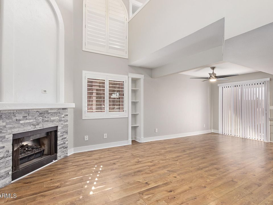 This charming property nestled in the Shadow Run Community is the one you've been looking for! Make yourself at home in a welcoming interior offering gleaming wood-look floor, soothing palette throughout, incredible windows, and a remarkable fireplace perfect for spending cozy nights in. The impeccable kitchen showcases sleek quartz counters, white shaker cabinets, recessed lighting, built-in appliances, and a convenient breakfast bar for quick coffees in the morning. Discover the loft-style bedroom featuring plush carpet in all the right places, a walk-in closet, and access to the serene balcony. Plus, a lovely covered patio ideal for alfresco dining or evening relaxation! Don't miss out on this one!