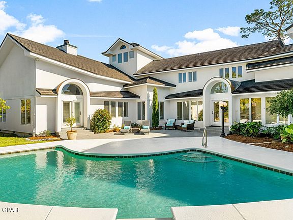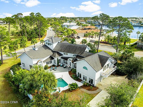 Luxury living meets coastal elegance at 1800 Weakfish Way in Bay Point Yacht Marina & Golf Club. Come home or invite guests to the most coveted waterfront neighborhood on the East End of Panama City Beach. This beautiful home provides 4 guest bedrooms, all with full ensuite bathrooms and multiple living spaces throughout an easy flowing floor plan centered around a gorgeous private pool. Plantation shutters throughout. The master suite is its own private retreat with tall ceilings, built-in shelving, decadent french doors that open to a private balcony overlooking palm trees, and a spacious bathroom with additional walk-in closets . With lush landscape, mature palm trees, peacefulness and water VIEWS of the Bay, 1800 Weakfish Way feels like a tropical vacation oasis. Natural sunlight throughout each space with plenty of room to spread out to rest, relax, work, play or entertain. Exceptionally well kept, along with a freshly painted interior, pool patio and new light fixtures, this home is ready for you, your family & friends.