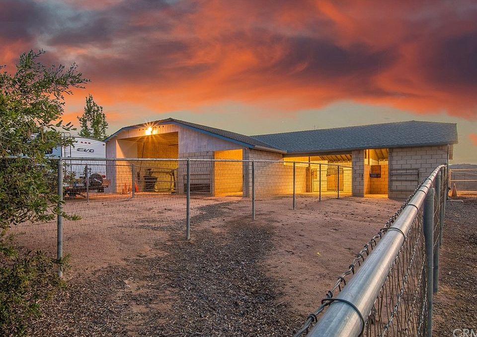PRICE REDUCED! This Ranch style custom built estate home is located in the Tenaja CSD. The home offers incredible panoramic views, equestrian facilities onsite with direct access to the riding trails, all while sitting on 4.29 acres in the privacy of your own gated estate. Your home offers a living area of 2,960 sq. ft., 9' ceilings, and features 3 bedrooms, 2.5 bathrooms, a den/library, a additional large 750 sq. ft. private office and meeting room complete with its own bathroom. A 650 sq. ft. workshop and an 1,000 sq. ft. 3 car garage which offers plenty of vehicle parking with enough room for your RV. Get your horses ready! Your estate also offers a separate 5 stalls within your 3,267 sq. ft. barn. As you walk into your home, you will be greeted with 9' ceilings, natural stone throughout the walkways; while the great room and bedrooms are adorned with Oak Wood floors. The double pane windows will help monitor the climate within the home while offering incredible west facing views and allowing the natural light to come flowing through. The large kitchen offers extensive cabinets, center island, walk-in pantry, and a butler's pantry. The kitchen is also clothed in an exquisite slab of imported granite. . Your two full bathrooms include jacuzzi tubs and the master bath comes complete with a walk-in shower and its very own heating system to keep you warm on cold winter days. This home has a well and water system and is one of the most energy efficient homes in this area.