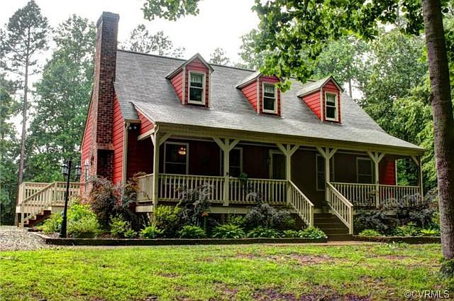 Beautiful 3 bedroom 2 bath Cape with hardwood floors throughout located on approximately 11 acres. Park like setting with mature trees, lush landscaping and located down a lovely winding private drive back off of the road. Rooms are oversized and kitchen has all stainless appliances and all convey, even refrigerator. Master is downstairs with attached bath. Living room is spacious and has a fireplace and built in book shelves. There is a separate small garage for recreational vehicles, and another building with electricity that makes a perfect workshop. The acreage goes way back behind the property providing opportunities for hiking, four wheeling, etc. Recent upgrades include the complete re-plumbing of the house, new hardwood floors, and a new hot water heater. An absolutely stunning move-in ready home in a private setting, yet just 20 minutes to Colonial Heights.