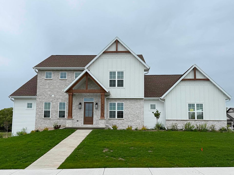 Brand new 1½ story home in Ledgeview’s desirable neighborhood! This stunning residence offers high-end finishes throughout, including quartz countertops, custom cabinetry, shiplap accents, and a stone fireplace. The 1st-floor primary suite features a tiled shower and free-standing soaking tub, while a spacious laundry room with natural light and an office off the foyer add extra convenience. A catwalk overlooks the great room, and the kitchen and dining area boast 10’ beamed ceilings. The large bonus room/4th bedroom sits above the garage. Complete with lawn, landscaping, concrete driveway, and sidewalks. The lower level is ready for future expansion, with egress and rec room windows for added light. Certified to be energy-efficient through Focus on Energy.