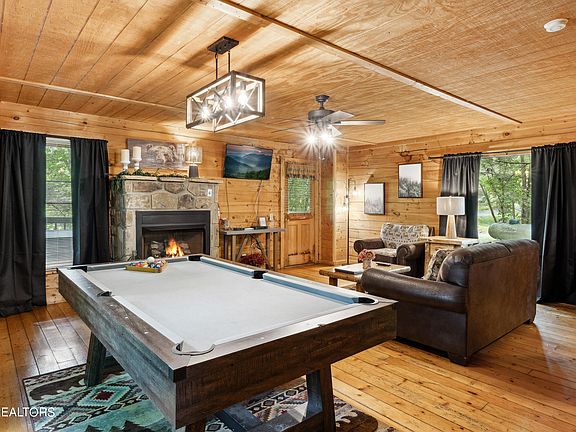 The main living area, located downstairs, sets the stage for unforgettable moments. A striking stone fireplace invites you to cozy up on chilly mountain nights, creating memories that will warm your heart. The allure continues with a well-appointed BRAND NEW pool table, perfect for friendly competitions and evening entertainment. Need additional sleeping space? The sleeper sofa offers room for two more, ensuring everyone can find their perfect spot within this cabin retreat.