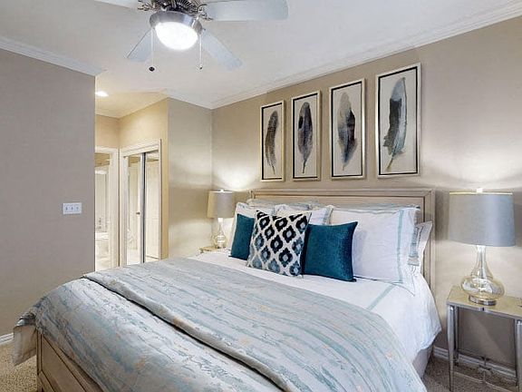 This floor plan includes full-size washer/dryer, mirrored closet doors, built-in bookcase, U-shaped kitchen and oval soaking tub with clear glass stall.