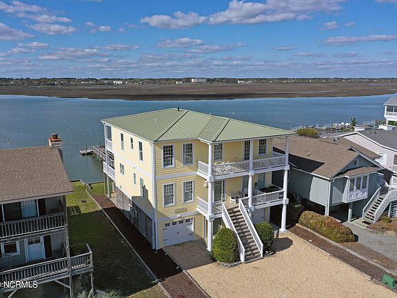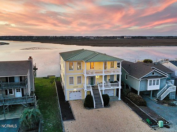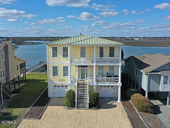 Experience the ultimate beach lifestyle with PANORAMIC VIEWS OF THE BAY from this stunning and fully furnished 5 BR, 5 1/2 BA beach house. This luxurious custom designed property sits on a one-of-a-kind lot and offers prime real estate at its finest. Enjoy direct access to the beach, ocean, and ICW just steps away from your door, along with pristine outdoor living that's perfect for relaxation, entertainment, and taking in the breathtaking views. The house boasts multiple decks and porches that are ideal for soaking up the sun, hosting gatherings, and taking in the gorgeous surroundings. A brand new floating dock is the perfect spot to park your boat and enjoy crabbing and fishing in your own backyard. Inside, you'll be greeted with an open living space highlighted by walls of windows that lead to a wide, spacious, rocking chair balcony with amazing views. The living area features beautiful Brazilian hardwood cherry floors, a cozy fireplace, and custom furniture from High Point, NC, the Furniture Capital of the World. The adjacent dining space shares an inviting wet bar and leads to a spacious chef's gourmet kitchen with stainless steel appliances, a huge breakfast island, imported granite countertops, and lovely custom white cabinetry. All five bedrooms host luxurious private baths, and there's also an office that could serve as another bedroom, as well as a second living space for entertaining that includes a wet bar and ice maker.