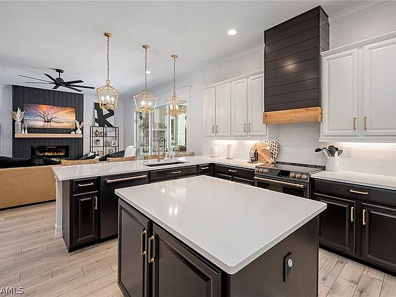 This breathtaking 5 bedroom, 4 1/2 bathroom lakefront property is located in Sandoval, one of the most popular gated communities in Cape Coral. This spacious property features a stunning kitchen with top of the line appliances (less than 2 years old), an island, quartz countertops, both formal and casual dining. The first floor also features a large den/office, as well as a guest suite with full bathroom that also serves as a pool bathroom. The primary bedroom is located upstairs with en-suite bathroom that features dual sinks, walk in shower as well as a separate tub. There are also 3 additional bedrooms upstairs two of which share a bathroom, while the third bedroom has an ensuite bathroom. The upstairs also features a loft area that can be used as a game room or "move theater room". The stunning backyard features an outdoor kitchen with BBQ, sink and beverage cooler, wood paneling on the ceiling, a large salt water swimming pool with hot tub that is controlled by smart technology , glass tile around the perimeter as well as travertine flooring that was installed on top of a concrete slab to avoid weed growth. Enjoy this private backyard Oasis year round.