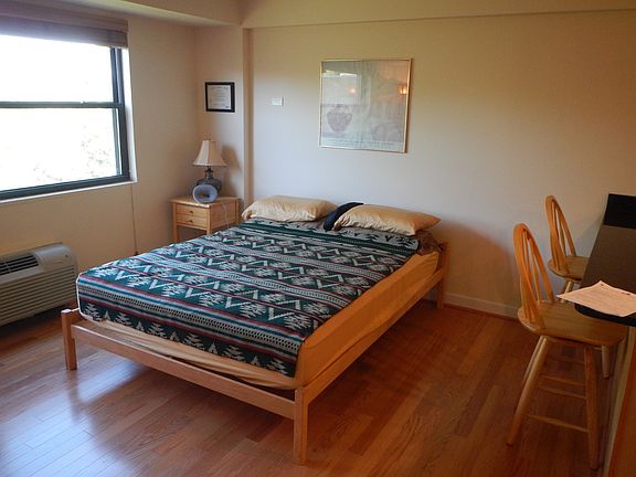 Bright sunny studio with views of Rock Creek Park and Zoo, Renovated Kitchen, brand new hardwood floors, ceramic tile bath, huge walk in closet, Convenient in town yet quiet location, Roof top deck, bike room, fitness center, laundry room, rental parking available, low monthly fee