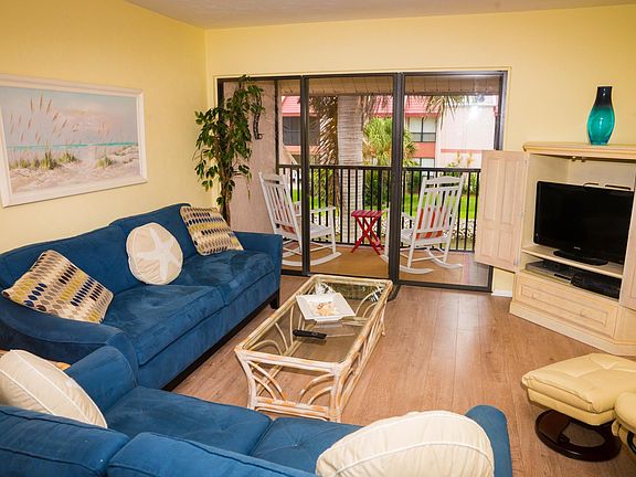 Weekly Rates available This non-smoking unit is over 1,100 sq ft with a screened in terrace complete with a quiet, peaceful view of the lagoon that flows through the center of the complex (see the pictures). Conveniently located close to Sarasota Airport (20 minutes) and the Tampa Airport (55 minutes). Also, close to major Florida attractions including; Busch Gardens (45 minutes), Disney World, Universal Studios and Sea World (2 hours). Master bedroom includes a new (as of 2018) King bed, flat screen cable TV, with a sliding door to the screened in patio. Full size closet, in unit washer and dryer and all of the linens and fixings for an enjoyable stay! Have guests or children, not a problem. Guest bedroom has a queen and twin bed with. We have a Queen pullout bed in the living room as well. Enjoy the convenience of a fully functional kitchen with full table settings and cooking supplies, full sized washer and dryer, and a private parking space reserved directly outside of your unit (guest spots also available). Other items include toaster, coffee maker, ice maker, beach toys and chairs! Condo include access to a beautiful, large heated swimming pool (the largest on the island), a tennis and bocce ball court, recreation room, sauna, exercise equipment, shuffleboard and a fishing pier. And of course, a beautiful beach only steps away. A wide selection of activities, gourmet restaurants and shops are minutes away, along with a free trolley which runs the length of Anna Maria Island. Take a stroll down the beach or Gulf Drive to Historic Bridge Street, which includes miniature golfing, restaurants, pubs, water-view seating for breakfast/coffee/drinks, and local jewelry and clothing shops. Max Capacity is 6 guests. Pets welcome on case by case basis. Units are typically rented out in Sat to Sat blocks (inquire for exceptions) 7 Day Minimum Stay