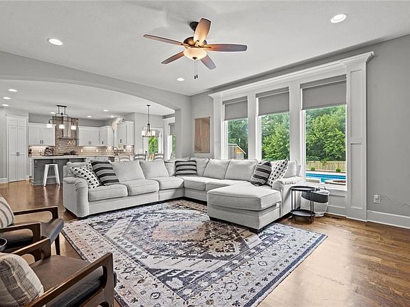 Stunning Raymore 5br, 3.5 bath 2-story in desired Estates at Knoll Creek. This open + impressive layout has it all! Finished lower level with large Family Room, wet-bar, full bath with tiled shower & 5th br/work-out room. Large Primary Suite features massive closet space, stylish tiled shower and stand alone tub. Large Laundry Room off Primary Suite for ideal convenience. Beautiful, heated inground pool with oversized/upgraded deck, swing set and well maintained yard... perfect for entertaining! Upgrades include: stylish quartz in kitchen, stainless steel appliances, gas range, covered patio, irrigation + much more. Coveted green space located on 1/3 acre lot. Ideal location just half a block from community pond and trail. Quick highway commute & L.S. access . A must see Raymore opportunity... Ready for delivery!