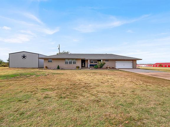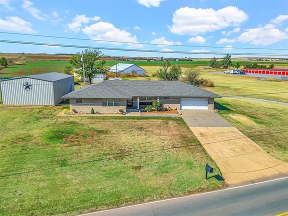 Enjoy the best of both worlds in this beautifully updated 4 bedroom 2 bath home. It's located just outside city limits but still has access to City water and sewer. This kitchen in this home is a show stopper. It has custom variable height cabinets with granite counters, stainless appliances and tile floors. The adjoining laundry room also has great storage, granite counters & sink. The floorplan flows from the eating bar in the kitchen to the den with gas log fireplace and out to the second living area. This room is separated with french doors & accommodates a formal dining room space and has direct access to the backyard. This area has it's own central H&A unit. You'll be amazed at the size of the bedrooms and the amount of storage. Outdoors is a new 30 x 50 shop with a 14' OH door and it's own 1/2 bath. There is also an oversized 2 car attached garage with direct access to a storm shelter. There is also a water well for watering the yard. This one is a must see!