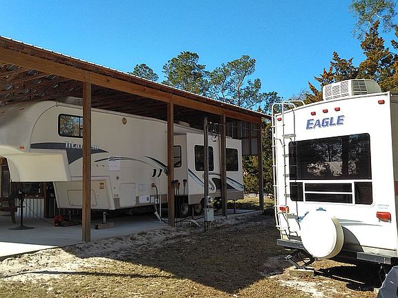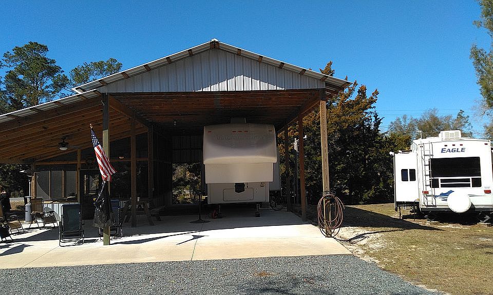 Included with property are two fifth wheels with slide outs Large poll barn, 36x48, with concrete slab and large screened in kitchen. Gravel driveway and handy house for storage. There are 3 total RV hookups on the property. Two miles from public boat ramp on SR 51. Great get away location for annual Fiddler Crab Festival and scalloping season. High and dry land.