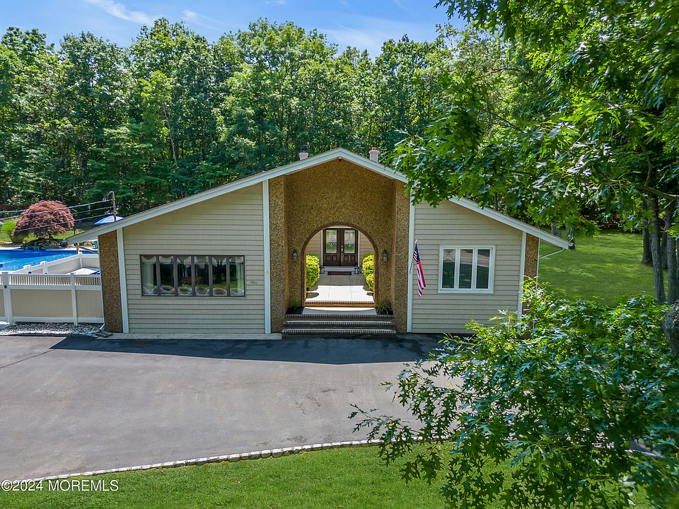 Experience resort-style life here at this custom Ranch home! Secluded 1.57 acres yet close to everything. Double door front entry opens to foyer w/2 closets & French doors leading to the sunlit Liv Rm with wood burning FP. Brand new Kitchen features quartz counters, glass tiled backsplash, gorgeous huge granite top Island w/induction stove top. Double wall ovens, dishwasher, refrigerator, & farmhouse sink all stainless. Entertaining is easy with this unique open floor plan. Kitchen is open to the extra large fam rm featuring wall of windows & electric FP for ambience. Primary BR w/full bath & 2 closets. 2nd & 3rd BRs are amble sized. Brand new hall bath. Full finished Bsmt ready to entertain. Sliders off Kit to paver patio & your resort-style pool area. Pool house w/AC is perfect for your guests to use as a changing area & is great place to set-up food & drinks. The 18x36 pool complete with waterfall. Pergola with firepit is included. Pool area bathroom (not permanent)