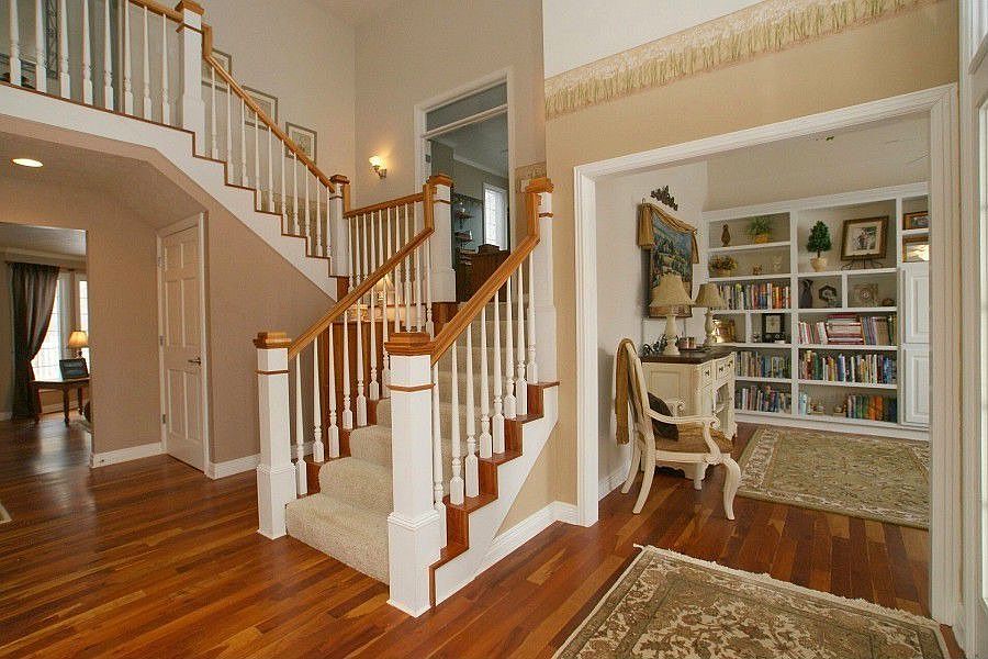 Phenomenal Timber Valley Home. You are welcomed by 2-story foyer, open staircase, library to the right, formal dining to the left & rich brazilian cherry hardwood flooring flows throughout main level. Open floor plan in living rm, kitchen & nook is ideal for entertaining, overlooks wooded view w/ deck access. Walk-out basement includes spacious family rm w/ lower level deck, 3rd full bath, 2 private bdrms & ample storage. 2nd level features master suite w/ private balcony deck, 3 bdrms & jack n jill bath. Other features: private office, hobby room, 2-zone GFA, crown molding, fireplace, built-ins, security system, Corian kitchen counters & eat-in island, golf course view.