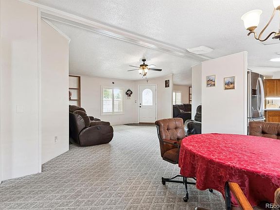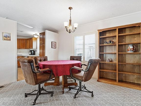 You'll be delighted with this spacious, beautiful, well kept home. It's wide open floorplan boasts large rooms, a fabulous kitchen and many windows providing natural sunlight. The large, living room and family room both have built-in cabinets. The kitchen is a cook's dream with an abundance of oak cabinets, high end appliances, pantry, endless countertops, and breakfast bar. The large primary bedroom sits alone for privacy with a walk-in closet and space for an office. The primary bath has french doors, walk in shower, updated vanity and a skylight. The remaining two bedrooms are roomy, closets to match and all three bedrooms have Hunter-Douglas Duette window treatments for cooler summers, warmer winters, and ceiling fans. The utility (laundry) has a washer and dryer that stays, closet, storage space and leads to back yard. LOCATION, LOCATION, as this sits on the corner, across the street from the pool, spa/hot tub, fitness center, community center, ballroom, meeting room, library and coin laundry but far enough away to have privacy from the large deck that affords a great view. Blue Spruce on each side of the deck also lends privacy. At the end of the covered carport is a generous 10' x 11' shed with shelves for extra storage. For accessibility, there is a ramp for the front door as well as the back door. Land is not included in sale. Land lease and terms are set by owners of the community and can change yearly. Buyer and their agent to verify all info. Community is for 55 and older buyers/ residents.