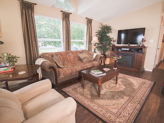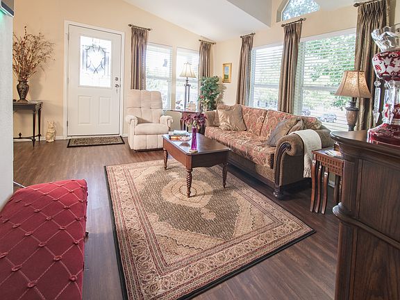 Gorgeous, high quality, numerous upgrades, professionally landscaped, no mowing, desirable corner lot, near the clubhouse, two covered porches w/composite decking, textured and painted vaulted ceilings and 6" thick walls, large double pane windows, custom drapes, rich faux-wood floors throughout (Coretec-Plus), Hunter ceiling fans, upgraded lighting, newer plumbing fixtures, lots of kitchen countertop space, numerous cabinets, granite topped island w/roll-out shelving. The furnace, A/C, and water heater were installed 3 years ago. The shingles on the home and Tuff Shed were replaced 6/2019 and come with transferable warranty. New security/storm doors and an extensive security system with cameras. An enforced age restricted community (40+). The HOA fee covers the land lease, trash pick-up, and professional management. This home sale requires a cash buyer and the community management's pre-lease approval. Taxes $252.98 (2018).