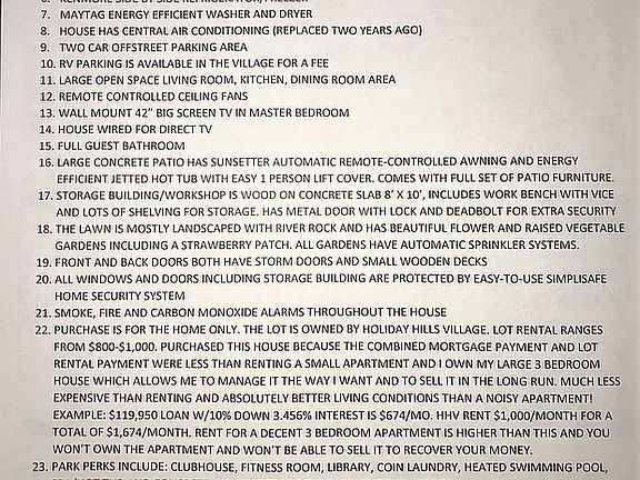 FACT SHEET 1. SINGLE FAMILY 24’ x 48’ HOUSE BUILT IN 2013 2. MEASUREMENTS: MASTER BEDROOM 17’ X 11.5’, GUEST BEDROOM ONE 12’ X 11’, GUEST BEDROOM TWO 11’ X 10’, LIVING ROOM 17.5’ X 14.5’, KITCHEN/DINING AREA 21’ X 10’, LAUNDRY 10’ X 6’ PATIO 31’ X 8’, TWO WOODEN DECKS ARE 5.5’ X 5.5’, PATIO AWNING IS 18’ X 10’, HOT TUB 6.5’ X 6.5’ 3. FORCED AIR GAS HEATING, 40 GALLON ENERGY EFFICIENT GAS HOT WATER HEATER 4. RANGE WITH OVEN IS GAS 5. GE DISHWASHER 6. KENMORE SIDE BY SIDE REFRIGERATOR/FREEZER 7. MAYTAG ENERGY EFFICIENT WASHER AND DRYER 8. HOUSE HAS CENTRAL AIR CONDITIONING (REPLACED TWO YEARS AGO) 9. TWO CAR OFFSTREET PARKING AREA 10. RV PARKING IS AVAILABLE IN THE VILLAGE FOR A FEE 11. LARGE OPEN SPACE LIVING ROOM, KITCHEN, DINING ROOM AREA 12. REMOTE CONTROLLED CEILING FANS 13. WALL MOUNT 42” BIG SCREEN TV IN MASTER BEDROOM 14. HOUSE WIRED FOR DIRECT TV 15. FULL GUEST BATHROOM 16. LARGE CONCRETE PATIO HAS SUNSETTER AUTOMATIC REMOTE-CONTROLLED AWNING AND ENERGY EFFICIENT JETTED HOT TUB WITH EASY 1 PERSON LIFT COVER. COMES WITH FULL SET OF PATIO FURNITURE. 17. STORAGE BUILDING/WORKSHOP IS WOOD ON CONCRETE SLAB 8’ X 10’, INCLUDES LOTS OF SHELVING FOR STORAGE. HAS METAL DOOR WITH LOCK AND DEADBOLT FOR EXTRA SECURITY. There is also a separate 8’ x 4’ storage shed. 18. THE LAWN IS MOSTLY LANDSCAPED WITH RIVER ROCK AND HAS BEAUTIFUL FLOWER AND RAISED VEGETABLE GARDENS INCLUDING A STRAWBERRY PATCH. ALL GARDENS HAVE AUTOMATIC SPRINKLER SYSTEMS. 19. FRONT AND BACK DOORS BOTH HAVE STORM DOORS AND SMALL WOODEN DECKS 20. ALL WINDOWS AND DOORS INCLUDING STORAGE BUILDING ARE PROTECTED BY EASY-TO-USE SIMPLISAFE HOME SECURITY SYSTEM 21. SMOKE, FIRE AND CARBON MONOXIDE ALARMS THROUGHOUT THE HOUSE 22. PURCHASE IS FOR THE HOME ONLY. THE LOT IS OWNED BY HOLIDAY HILLS VILLAGE. LOT RENTAL RANGES FROM $800-$1,000. PURCHASED THIS HOUSE BECAUSE THE COMBINED MORTGAGE PAYMENT AND LOT RENTAL PAYMENT WERE LESS THAN RENTING A SMALL APARTMENT AND I OWN MY LARGE 3 BEDROOM HOUSE WHICH ALLOWS ME TO MANAGE IT THE WAY I WANT AND TO SELL IT IN THE LONG RUN. MUCH LESS EXPENSIVE THAN RENTING AND ABSOLUTELY BETTER LIVING CONDITIONS THAN A NOISY APARTMENT! EXAMPLE: $119,950 LOAN W/10% DOWN 3.456% INTEREST IS $674/MO. HHV RENT $1,000/MONTH FOR A TOTAL OF $1,674/MONTH. RENT FOR A DECENT 3 BEDROOM APARTMENT IS HIGHER THAN THIS AND YOU WON’T OWN THE APARTMENT AND WON’T BE ABLE TO SELL IT TO RECOVER YOUR MONEY. 23. PARK PERKS INCLUDE: CLUBHOUSE, FITNESS ROOM, LIBRARY, COIN LAUNDRY, HEATED SWIMMING POOL, SPA/HOT TUB AND CONCRETE WALKING TRAILS THROUGHOUT THE VILLAGE BUYER MUST BE APPROVED BY HOLIDAY HILLS VILLAGE MANAGEMENT BEFORE PURCHASE OF THIS HOME. CALL 303-428-6313 FOR APPOINTMENT OR GO TO: Holidayhillsvillage@equitylifestyle.com for more info. PLEASE GO TO https://www.zillow.com FOR MORE INFORMATION AND PHOTOGRAPHS 1801 W 92nd Ave LOT 669, Federal Heights, CO 80260 | Zillow