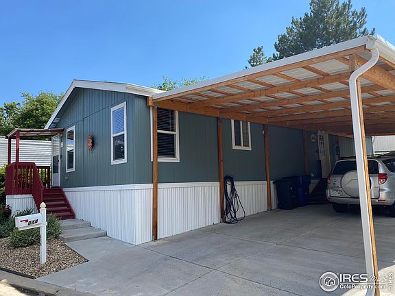 Hello retirement! Located in a 55+ Community this home has everything you need! Huge 3 car carport, large shed, wrap around deck that extends to the backyard(very private), fenced in yard, all new laminate floors throughout the house in 2021, new baseboards, all stainless steel appliances included, all new indoor paint! Come check out this great 3 bed 2 bath home-you will not be disappointed! Walk in shower in the primary bedroom, full bathroom with tub and shower, laundry room with stackable washer and dryer included! All one floor living! Convenient, close to the bus stop, I25, HWY 287, trails throughout the neighborhood, community pool, community room and hall, new friends & fun! Lot rent $1008 Monthly. Lenders available.