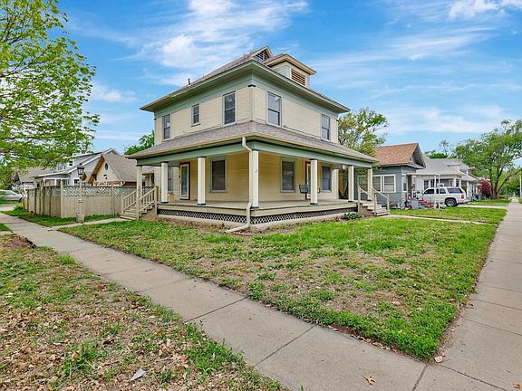 This historical Victorian home in West Wichita has all the charm and character you could wish for!  Located near Delano and close to West Wichita shopping and Friends University, this is a wonderful home for anyone looking for space and historical charm.  The large front wrap-around porch faces out onto both Maple and Vine streets.  Step inside to beautifully preserved real wood trim and baseboards, large windows, and stained glass transom windows.  There are exposed hardwood floors in the dining room, and the main floor also boasts a formal living room, family room, and large kitchen.  Upstairs are all four bedrooms, including the spacious master with hardwood floors.  Two bathrooms and a laundry room complete the interior of this home.  Outside, on the large corner lot, there is a gazebo patio area, perfect for entertaining, three garages, and a huge carport!  There is also a fenced yard and mature trees for shade.  Don't miss out on this lovely historical home!