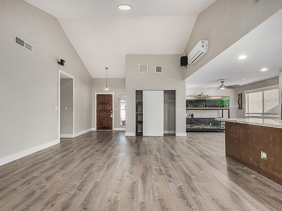 Move-in ready! Make yourself at home in this charming residence that is now available! Displaying a desert front yard, a 2-car garage, an RV gate, an extended driveway, and a cozy front porch. The spacious interior boasts a welcoming living room enhanced with vaulted ceilings, surround sound, wood-style flooring, and a warm fireplace. The eat-in kitchen is the heart of the home, featuring SS appliances, granite counters, a tile backsplash, beautiful wood cabinetry, recessed lighting, a handy pantry, and a breakfast bar. The grand main suite has a sliding barn door leading to the private bathroom with dual vanities, a jetted tub, a walk-in closet, and French doors to the backyard. Enjoy afternoon relaxation under the covered patio in the perfectly sized backyard! Don't miss out! Renter's and pet insurance (if applicable is required) . No smoking is allowed. Tenants are responsible for all utilites and caring for the landscaping including the pond.