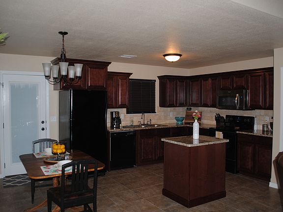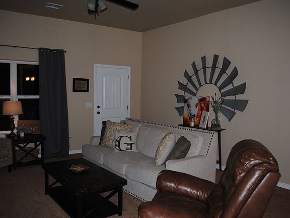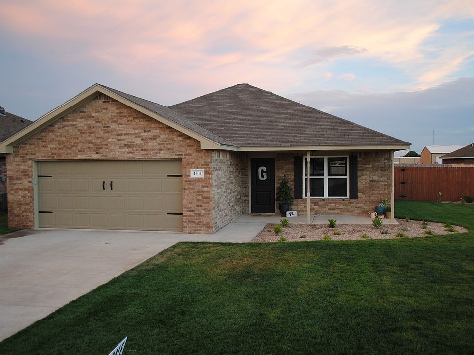 1801 Wagon Trail Rd, Dalhart, Tx, 79022 A Must see, built in October 2015, 3 Bedroom, 2 Full Baths with a 2 car Garage. This home offers 1367 square feet of living space, featuring a vaulted ceiling in the carpeted Living room, and open to the dining and kitchen area. Kitchen has dark cherry cabinets, granite counter tops, tumbled stone backsplash, tile floors, upgraded faucet, pantry, kitchen Island, stove , built-in microwave, dishwasher and disposal. Dining has a chandelier, tile floors, and French door leading out to a large patio. Master suite has step ceiling, ceiling fan, carpet and a large walk-in closet. Master bath has double sinks, granite counter tops, tile floors and a tub/ shower. The hall bath has a single sink, granite counter tops, upper cabinetry, tile floors and a tub/shower. Two other bedrooms have carpet. Hallway also offers a built in shelved linen closet. Utility room leads to garage, tile floors, washer/dryer hook–up, cabinetry and shelving with a linen closet. Garage offers a pull down attic, wired with cable, has custom shelving for extra storage, and features an updated garage door design. Beautifully landscaped yard, sprinkler system, double pane windows with dark stained 2” privacy blinds, central heat and air, 6 ft stained wood fence, concrete slab and patio. Call for a Showing !!