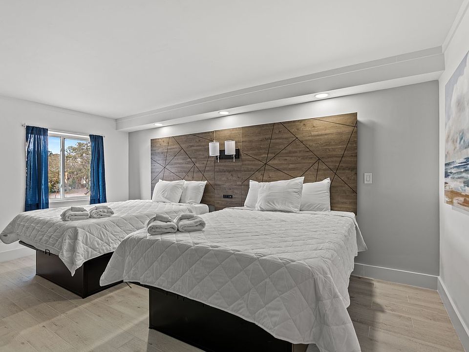 Welcome to Fin's Inn! Just 2 short blocks from sandy beaches, our cozy room welcomes you with two queen-sized beds adorned with soft linens. Relax with the sleek TV directly across the beds. A mini-fridge and coffee maker are nearby for convenience. Freshen up in the full bathroom stocked with plush towels and complimentary toiletries. Whether with family, friends, or colleagues, our room offers comfort and functionality for your stay.