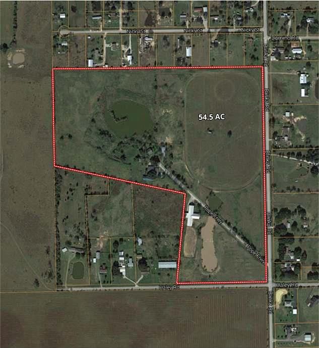54.5 Acres on corner just 3 miles from Hwy 290. Plenty of room for horses (24 stall barn, plus small barn), 2 homes, 3 large ponds. Lots of potential.