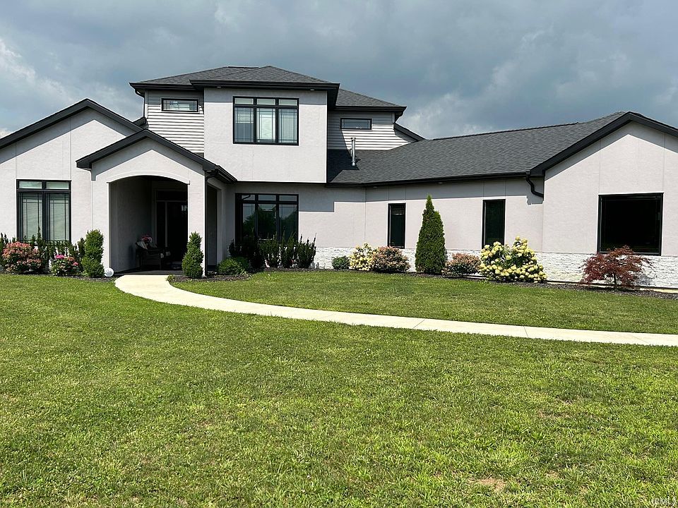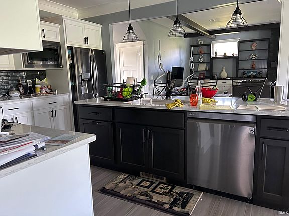 Beautiful home on 5 1/2 ac. in the Leo school district! A picturesque property with a shared pond. Very energy efficient. 6" walls, batting and sprayed. Floors and showers on the main floor are ceramic. 2nd floor is vinyl plank. Open concept for large group entertaining. Beamed ceiling in Living room and den. Garage entry has Large mud room and full bath. There is a 2000 sf out building with garage doors on front and back. You have a back yard covered patio and an uncovered patio. Gas grill and generator hookup.