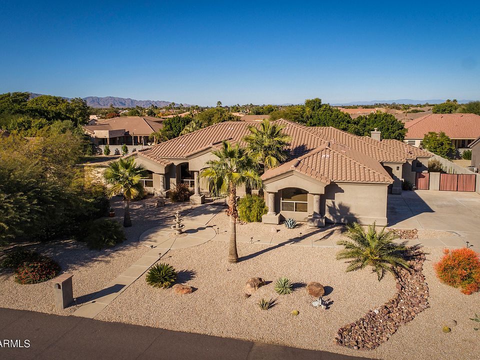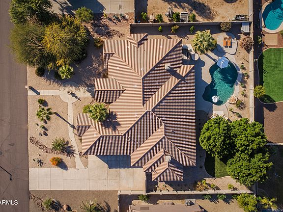 Immaculately kept, sprawling home with private pool, double kitchen islands and so much space to live, work, play and entertain! The custom built split floor plan boasts soaring ceilings throughout, a jack-and-jill setup, nicely upgraded kitchen with reverse osmosis, wine storage and walk-in pantry, and still the potential to truly make this home yours! Enjoy a zen and spa-like experience in the primary suite with a dual-sided fireplace and huge soaking tub, double vanities and spacious closet with private access to the back yard. Laundry room doubles as a mud room from front of home. Lengthy, three-car garage with built-ins and some workshop amenities. Accordion back door opens to an outdoor kitchen, private pool, mature foliage including fruit trees and turf yard! This home has it all!