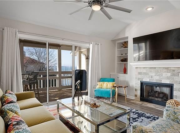 That view from the Owners Suite! Updated Rare Top Floor End Unit in highly desired Baybridge community on Lake Norman. The upper floor end unit offers higher vaulted ceilings and amazing year round, long range views of the water and the Marina. This unit has been fully updated with fresh neutral paint, new high end ceiling fans, new kitchen backsplash and lighting, cabinets have been professionally refinished, and a new refrigerator. The bathrooms were fitted with new vanities and marble counter tops, sinks, faucets, lighting and professional tub resurfacing. The fireplace is freshly tiled and a new hearth added. Don't miss the beautiful Theodore Alexander Chandelier hanging in the dining area. As a huge bonus the condo is being sold fully furnished in furniture by a professional designer. Some of the brand names you will see are, Temple, Theodore Alexander, Century, and Essential Living. Morningstar Marina is next door and has great slip price