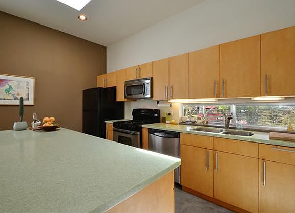 Modern home, designed by local KRDB architects, is built on a huge lot and backs to green space. Be the next Urban Gardner! Bike, Scooter or Walk to all that is cool on the East Side. Inside, ten foot ceilings, two skylights, concrete floors, and bountiful windows add to the sense of openness. The kitchen, dining and living room are all connected for an open concept, while the front and back entries create a cozy and intimate effect as you enter the home. Custom window treatments, desk and shelving. Ample parking. Next to MLK metro station. Solar electric for very low utility bills. Storage building in back blends with home.