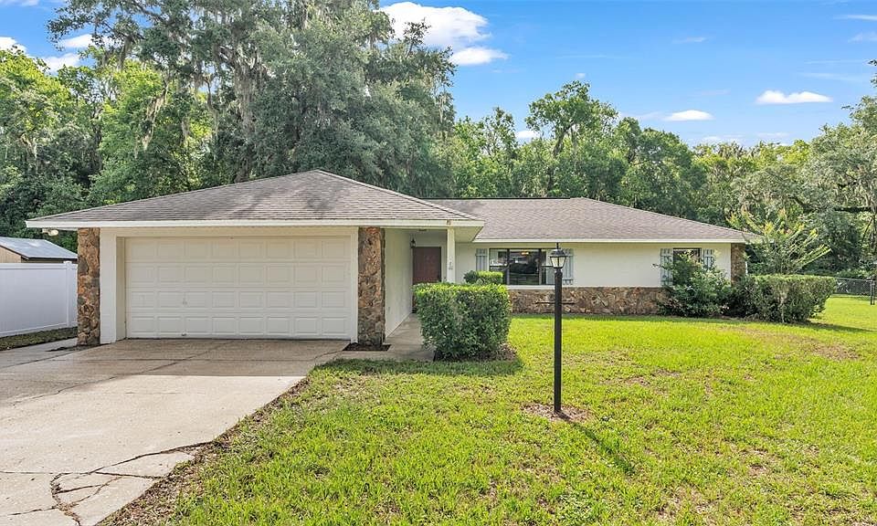 **Sellers will provide a $10,000 credit towards Buyers closing costs and prepaids with the purchase of this home** Welcome to this inviting 3 bedroom, 2 bathroom move-in ready home nestled on a peaceful cul-de-sac, featuring a fully fenced yard spanning a generous 1-acre property. Perfect for outdoor enthusiasts, there's ample space for boats, RVs, and other toys right on site. Inside, the home boasts a desirable split bedroom floorplan complemented by upgraded luxury vinyl wood look flooring throughout. Upon entering through the front door, you're greeted by a welcoming foyer that flows seamlessly into the spacious living area, dining area, and kitchen. Vaulted ceilings and strategically placed windows invite abundant natural light into the home. The primary bedroom suite occupies a private wing of the house, complete with an ensuite bathroom featuring a convenient step-in shower. On the opposite side, a hallway leads to the guest bathroom and two equally sized additional bedrooms, ideal for family or guests. French doors open onto the screen enclosed lanai, offering a tranquil retreat overlooking the expansive yard. Here, mature trees create a serene wooded oasis, ensuring privacy and providing a picturesque backdrop for outdoor activities and relaxation. The septic was installed in 2021, roof in 2017 and AC system in 2014. Conveniently located near Lakeside Village, with easy access to the Polk Parkway and I-4, this home is also in proximity to major employers such as Geico and Publix corporate offices, as well as the Lakeland Airport. Enjoy close proximity to a variety of dining, shopping, and entertainment options. Don't miss out on the opportunity to tour this delightful home — schedule your visit today to experience its charm firsthand!