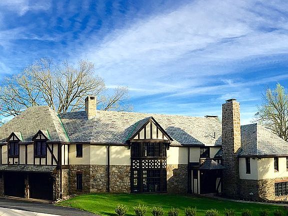 Public:Beautiful stately Tudor Style home that sits on top of Hill Road on one acre lot surrounded beautiful views and forest. The home features 8 unique bedrooms, 3 with fireplaces, and 6.5 bathrooms. Beautiful classic woodwork throughout the home including random with hardwood flooring. The property is located on a one acre lot with flagstone walkways and patios and a framed out tennis or basketball court. Three car garage. This home needs some cosmetic attention throughout.
