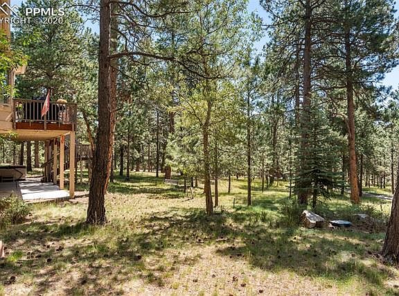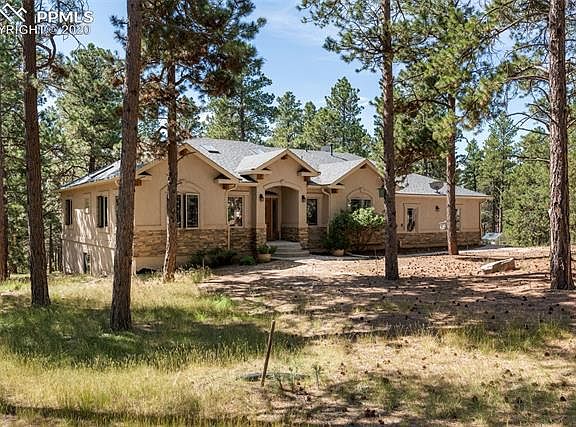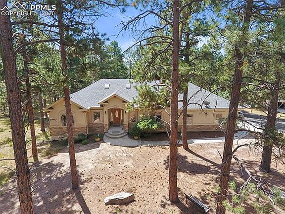 Expansive custom built rancher perfectly positioned and nestled on 5 acres of towering pines in Black Forest! Over 5,500 sq ft with complete main level living. 3 bedrooms, 3 baths and laundry on the main level. 2 additional bedrooms and 2 baths in the basement. Two master suites - one on the main level and one in the basement. All bedrooms are attached to baths. Open concept main level with a spacious great room with stacked stone fireplace, custom built-ins, skylights, vaulted ceilings, large windows, a walk-out to the composite back deck. The kitchen is open to the great room with Corian counters, large pantry, hardwood floors, island, double oven, gas cook-top, stainless appliances, tons of recessed lighting and an breakfast nook. Formal dining large enough for a 12 seat dining room table. The dining room has crown molding, wainscoting, hardwood floors, tray ceiling with ambient lighting and a built-in buffet with marble top. Master suite with walk-out to the back composite deck. The master has a walk-in closet, hardwood floors, tray ceiling with ambient lighting, crown molding and a 5-piece bath w/ jetted tub and seamless solid surface shower. Low maintenance stucco and stone exterior. Excellent outdoor entertaining on the composite deck with awning. The seller is currently having a new composite deck installed prior to closing. High end energy efficient casement windows. All solid surface baths with no shower grout lines. Finished walk-out lower level with a huge family room featuring gas stove, safe room/wine cellar, wet bar, walk-out to lower level patio with hot tub. Zoned for horses. Outbuildings allowed. The home is tucked on a hill with tons of privacy and a beautiful setting. Attached 3 car finished garage. Convenient commute to Colorado Springs or Denver.