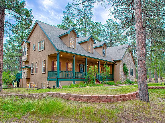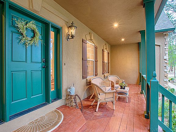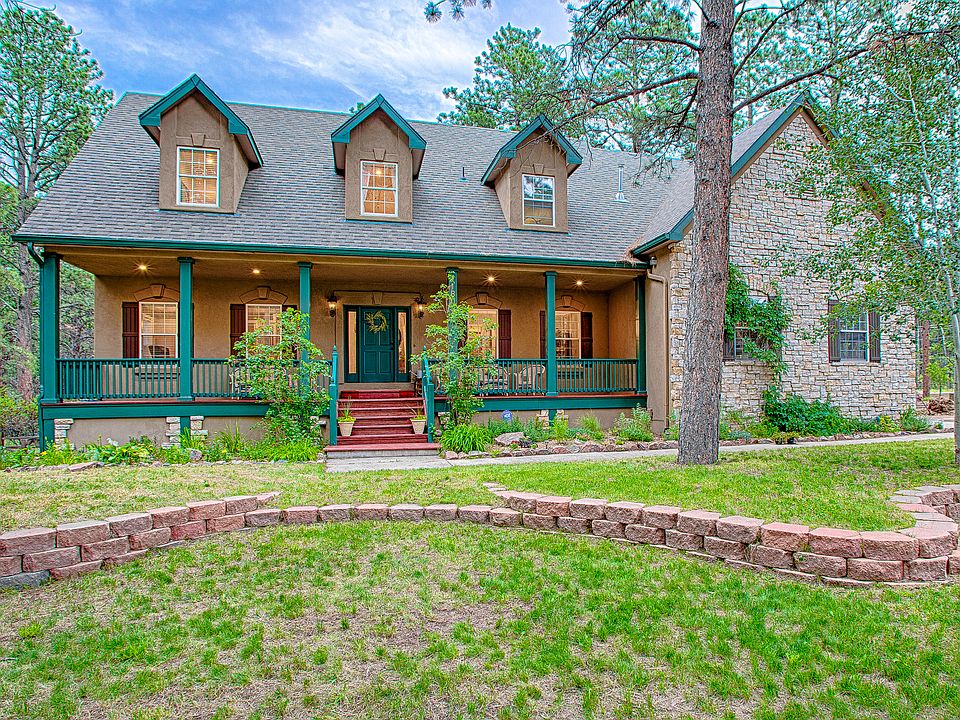 Beautiful, quaint custom home on 3+treed acres, 4 of 5 bedrooms are on 1 level! Wood floors everywhere, custom stone archways, 3 gas fireplaces. Great floor plan for families and entertaining with lots of outdoor living space and a huge corner lot. Warm and welcoming front porch is set back in the trees. Main level features flexible office/formal living room, french doors lead to formal dining room with crown molding and recessed lighting, plus a convenient half bath. Living room has a stone gas fireplace and is open to the dining area and kitchen. Large gourmet eat-in kitchen w/custom cabinets, 2 inch raw-edge granite counters on island, stainless steel appliances, 5-burner gas cooktop, double wall oven, desk area, and eat-in dining with walk-out to the wood deck.