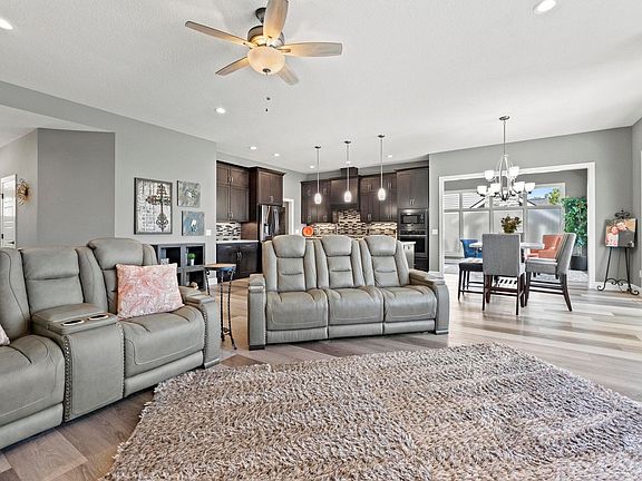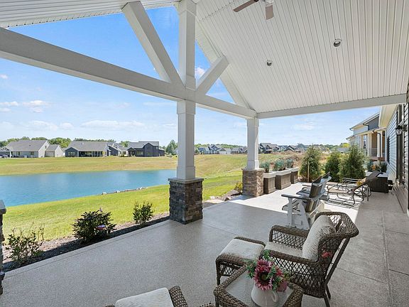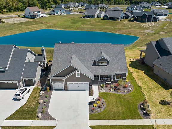 Why build new when you can buy this like-new gorgeous ranch home on a full basement? This home has it all! Beautiful ranch home with all of the square footage you need. Enjoy the spectacular views of the pond through floor to ceiling windows. Relax on the covered veranda with a woodburning fireplace. Open concept floorplan. The gourmet kitchen has custom stained cabinetry with an 8-foot island, quartz counters, wood range hood, gas cooktop and separate built-in oven. Oversized 10'x6' pantry with wood shelves. Sunroom allows you to have flex space. The owners suite has a soaring cathedral ceiling and spacious bathroom with a freestanding tub, double sink vanity and tile shower. 2 Bedrooms with secondary full bath also on main. Large laundry room with cabinets and sink. Half bath completes main floor. The finished lower level is perfect for your hobbies with all of the space you need. A fourth bedroom in the basement with a large walk-in closet and a full bath is great for guests. Extra large storage space. The basement is plumbed for a future wet bar. Professional landscaping and irrigation system. Epoxy covering on front porch, rear patio, and basement storage. Multiple internet and cable options.