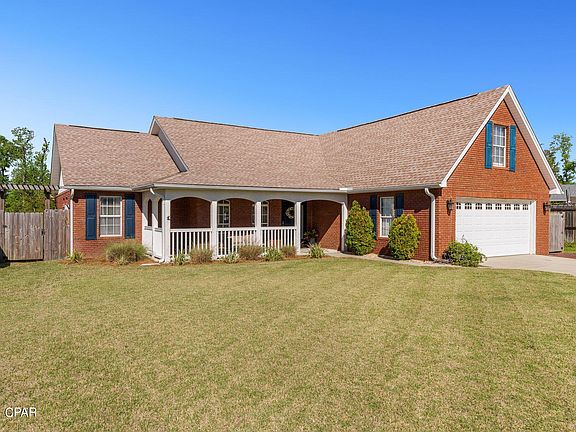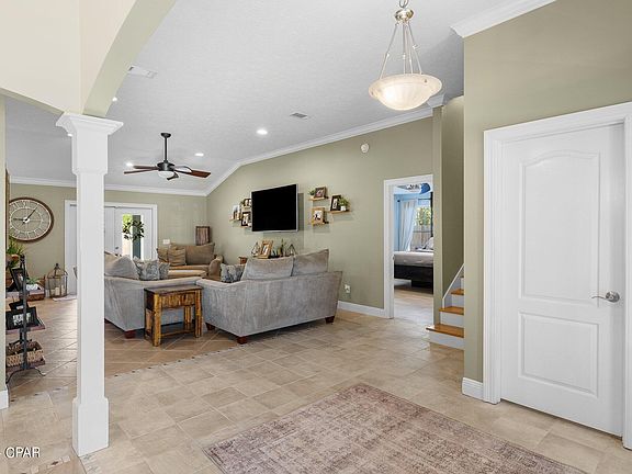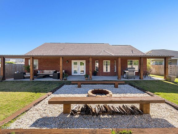 Navigate through the French doors in the living room to discover the impeccably manicured backyard, enclosed with a privacy fence. The back patio spans the full width of the house, boasting a tongue and groove ceiling adorned with recessed lights. Also, the backyard features a fire pit with benches and an outdoor shed for storing lawn equipment. Finally, behind the fence, your view and privacy are protected by a Bay County retention easement.