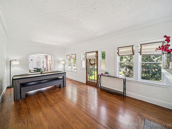 Where vintage architecture and modern updates perfectly align. This 1926 home in the highly sought-after Woodward Park Historic District offers over 2,000 sq ft (court house) of timeless character. Original hardwoods, arched doorways, stained glass accents, and built-in bookshelves highlight the craftsmanship of the era. Light-filled spaces include a sunroom wrapped in windows, a vintage-style kitchen with modern upgrades, and a spa-inspired master bath retreat. Thoughtful improvements throughout provide comfort while maintaining the home’s original charm. Abundant storage, a cedar-lined closet, fenced corner lot with mature trees, manicured landscaping, private deck, and updated 2-car garage complete the picture. A rare blend of history, architecture, and modern living in one of Tulsa’s most desirable neighborhoods.