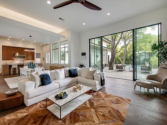 The Sharon House was created by Matt Garcia Design and built by Roost Custom Homes with the utmost attention to detail, sophistication and functionality. Located on over half an acre in Central Austin, this sleek, clean lined home was built to appeal to the most discerning buyer. Details The main home includes an open living, dining and kitchen that looks over half an acre of forest-like setting. Hidden on the banks of Johnson Creek, you will find ancient Oaks and tall Cedar Elms surrounding this architectural masterpiece. A private study has walls of windows to allow natural light into a tranquil workspace. The master suite sits on the first floor yet privately separate from all living spaces. The master features a fireplace and opens to a private patio. The master bath has an oversized shower and large soaking tub cornered by commercial windows letting in natural light. Upstairs features 4 spacious bedrooms and bathrooms as well as a large living space. A separate 3-car garage features a guest suite above with an office, bedroom, 2 1/2 baths and a large living space. Over 2,000 square feet of decking surround the outdoor entertaining areas and pool. This home truly brings the outdoors inside to create a serene home as well as the perfect place for entertaining. 6 beds | 7 baths | 2 half baths | 3 living | 3 garage | 6,584 sq ft (builder) Location Located in the heart of Tarrytown, The Sharon House sits on a .696 acre lot that backs to Johnson Creek. Built for ultimate privacy in a Central location, mature oak and elm trees create a peaceful setting. Minutes from Downtown Austin, schools and steps from West Enfield Park.