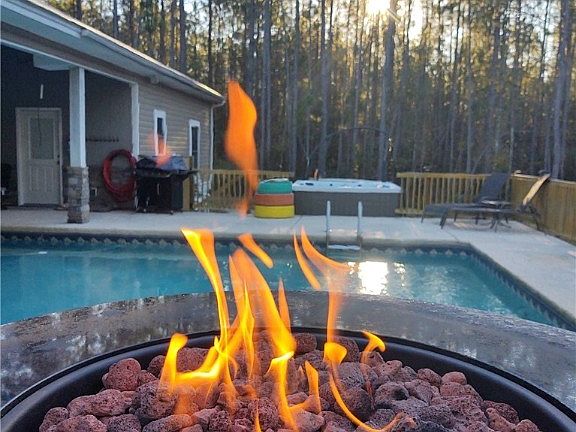 Beautiful home tucked away from any street noise & surrounded by mature pines. Large bdrms, two mstr suites, playroom, craft room/office. Extra Large family rm, dining rm & kitchen. Full size refrigerator, full size freezer, bar seats 10, all overlooking pool area, half covered half open. Walk upright in 1000+ sqft attic w/insulation & flooring; access from garage pull down ladder. Driveway can park 8 cars. Spacious garage w/rm for 2 cars, workbench, storage & sink. Intercom system. All built in cabinets & floating shelves stay. 2 hidden doors. Large deck, fire pit, small pond, well house & pergola. Pool can be heated (needs tank). Hot Tub. 2 separate water heaters & HVAC systems. Coat closet, gaming closet, tall windows, ceiling fans in every room, wood floors in main lvng area & one master, carpet in other rooms, tile in kitchen, laundry and bathrooms. Purchase with MLS 298253 & take land at discounted price of $175,000 making total land for purchase 48.77 acres. Don't miss this one!