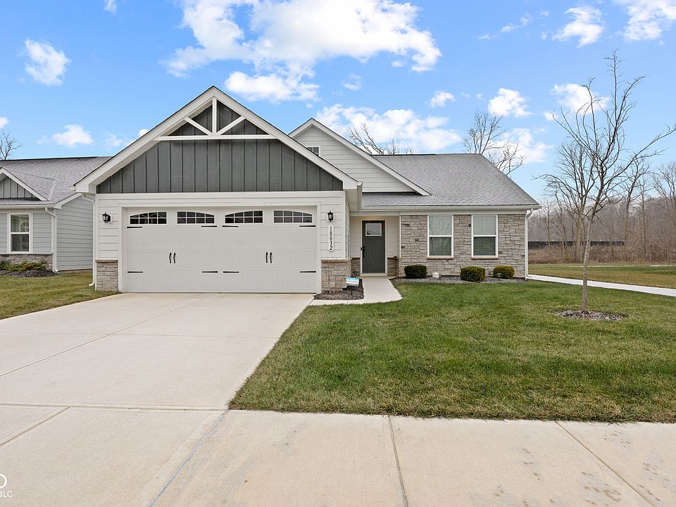 Home is only 2 years old and ready for a quick move in. Beautiful Stone and Cement Board siding - lots of character. Quiet section of the neighborhood. Open floor plan with 9' ceilings.-blinds included. Neutral colors throughout. Huge gourmet kitchen with Gas Range, stainless steel appliances- Large Center Island, staggered cabinets- Pantry. Eat in kitchen space overlooking private wooded tree lined lot. Primary Suite with large Walk In closet, dual raised sinks. LVP in all areas except carpet in bedrooms. Finished 2 car garage with extra bump for trash cans or storage. Energy efficient home with Low Utilities. Lots of walking trails throughout the neighborhood - including a neighborhood Pool. Close to Grand Park and all that Westfield has to offer.