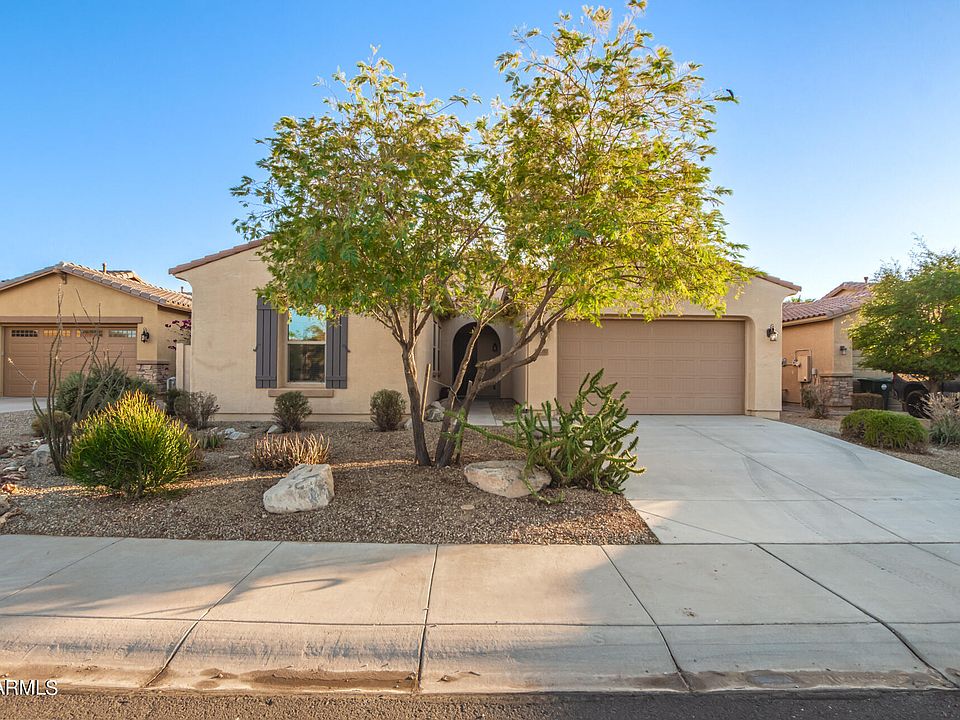 *Premium VIEW LOT = fabulous home reveals a thoughtfully designed 3 beds, 2 baths, and a 3-car garage! Inside, you'll find tile flooring, ceiling fans, and soft palette that creates a welcoming atmosphere. Formal living room and the harmonious great room are made for entertaining. Well-appointed kitchen boasts a pantry, glossy SS appliances, staggered cabinets topped with crown moldings, recessed & pendant lighting, a prep island with a breakfast bar, and granite counters. Don't miss the dining area with a lovely bay window! Surely to impress with the large & bright main bedroom offering plush carpet, sitting area, a bathroom with dual sinks, and a walk-in closet. Serene backyard provides a covered patio, built-in BBQ, and enough space for fun gatherings. This unique gem won't last long! Surrounded by majestic mountains and wide-open desert vistas, life in Estrella is a masterpiece of harmonious balance. Dynamic, yet serene it offers young couples, families, and retirees a resort-inspired lifestyle with state-of-the-art amenities. Estrella communities feature remarkable living with rich architecture,