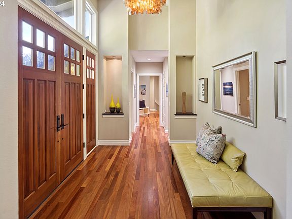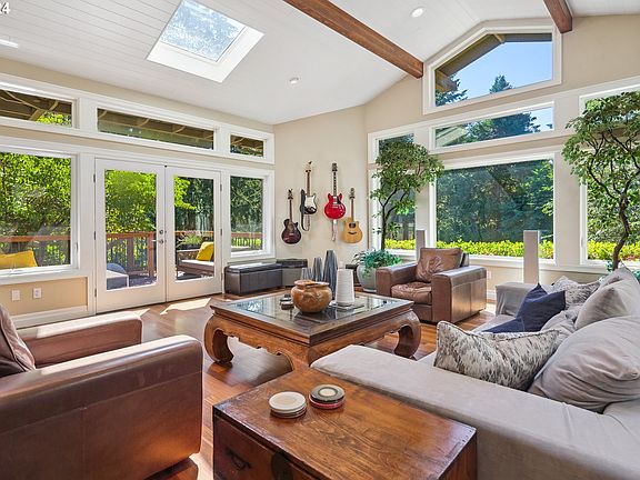 Discover serene luxury nestled in the Skyland neighborhood, one of Lake Oswego’s most coveted locations. This contemporary home sits on a generous .82-acre lot backing to lush green space. Offering a perfect blend of elegance and comfort this home is an entertainer's dream with a layout featuring a spacious kitchen with top-of-the-line appliances, Brazilian cherry floors, and large windows framing picturesque views. The main floor includes a luxurious primary suite with a spa-like bath and a home office with built-ins. Enjoy seamless indoor/outdoor living with decks spanning both sides of the family room, overlooking a park-like backyard with plenty of room for a future pool. Downstairs, three additional bedrooms include a guest suite with a Finlandia sauna, a separate entrance, and a deck with a Marquis Spas jacuzzi. The backyard also features a separate game room with a wet bar. Located near the 6.16-acre Troon Open Space and less than 10 minutes from downtown Lake Oswego, this home offers convenient access to the Hallinan Elementary School District’s Greentree Pool, Hazelia Field, Rassekh Park, and the new LO Recreation and Aquatics Center.