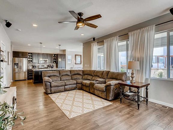 Welcome to the Reunion community. This home will invite you in the moment you step through the door. There is a sun drenched office and half bath well suited for the office at home professional, and a large living room which opens to the heart of this home, a gourmet kitchen and dining area. The kitchen boasts an oversized island, stainless steel appliances, and espresso cabinetry with an upgraded backsplash. Enjoy your summer evenings on the covered patio with the 42" TV and plumed gas line perfect for your grill and entertaining. Upstairs you will find your master retreat, with a beautiful oversized bathroom and large walk-in closet. The two secondary rooms are perfectly paired with an additional upstairs bath and upstairs laundry. The basement is unfinished with rough in pluming and ready for your custom designed finishes. There is also has a large crawl space for additional storage. In addition to the energy efficient solar system, this home also has Vista V38 film on the upper level windows and V28 on the main floor to protect against harmful UV rays. This home is within easy walking distance of trails, parks, ponds and all the incredible amenities Reunion has to offer, including a waterpark/pool, coffeehouse, and recreation center. Conveniently located next to E470, you have quick access to Downtown Denver, DIA, Buckley AFB, or NoCO.