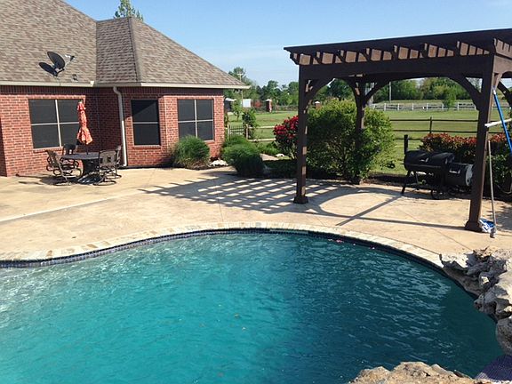 Located in the Village at Sparta, Bixby, Oklahoma, just off 181st between Memorial and Sheridan. The house was built in 2005 and sits on ¾ of an acre. It has 4 bedrooms, 3 full baths, living room with fire place, formal dining, kitchen with a breakfast nook, and security system with cameras. The custom saltwater pool is 10-1/2 deep and features a cave, waterfall, slide and tanning ledge. The backyard also has two pergolas and large outdoor fireplace with wood box. Solar screen window covers were installed last year on the west facing windows. The backyard has a separate third car garage for extra storage. This home is located in the top rated Bixby school district. To schedule a time to view the property listed call (405) 208-0252.