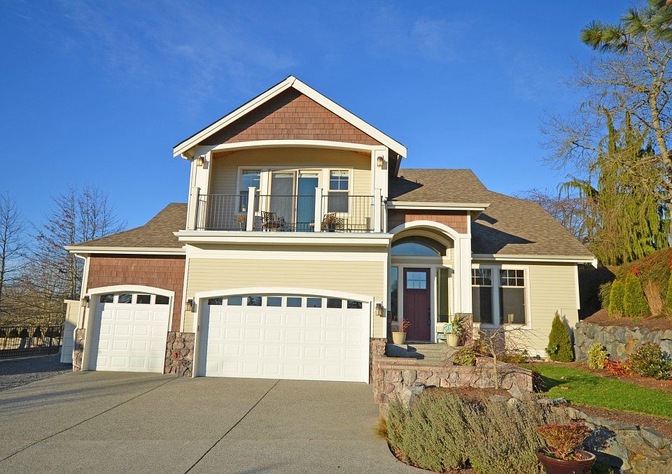 Custom Craftsman upscale home with picturesque backdrop territorial sound views. Discover a full integration of architectural brilliance and detail. Million dollar home kitchen with generous rich granite slab counters, high end stainless steel gas range and fridge. Rich hardwood floors, soaring high ceilings and detailed ornate gas fireplaces. Grand vaulted ceiling master suite with attached walk out private covered deck & luxury 5 piece bath. Central AC, Full surround sound system. Must see.