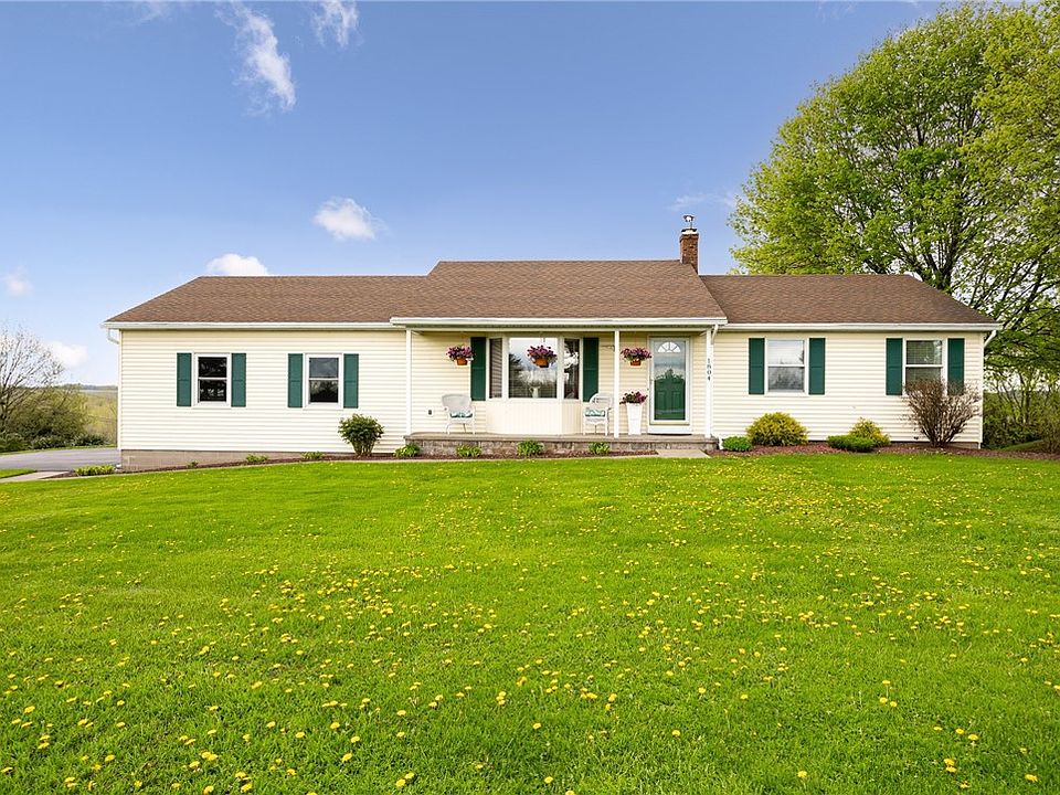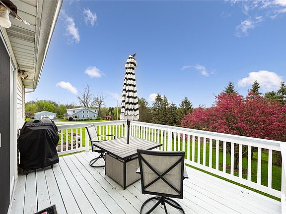 Say hello to 1804 Barnes Rd, a beautiful two-bedroom two-bath ranch with a spacious two and a half car garage. You'll find ample closet space in the large primary bedroom, a small breakfast bar in the kitchen, and a meticulously maintained .82 acre lot. Enjoy the view from the updated balcony off the eat-in kitchen during the warmer months and the wood burning stove during the colder ones. The first floor is 1090 sqft. An additional 1000+ sqft can be found in the finished walkout basement with possible third bedroom or office space. All kitchen appliances (including the microwave, TV, and brand new fridge), washer, dryer, grill, and snow blower are included. Don't miss out on this MOVE-IN READY charmer. Showings begin May 14, 2025. Delayed negotiations begin May 20th, 2025. All offers are due at 1:00pm.
