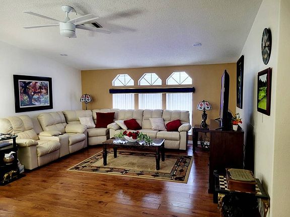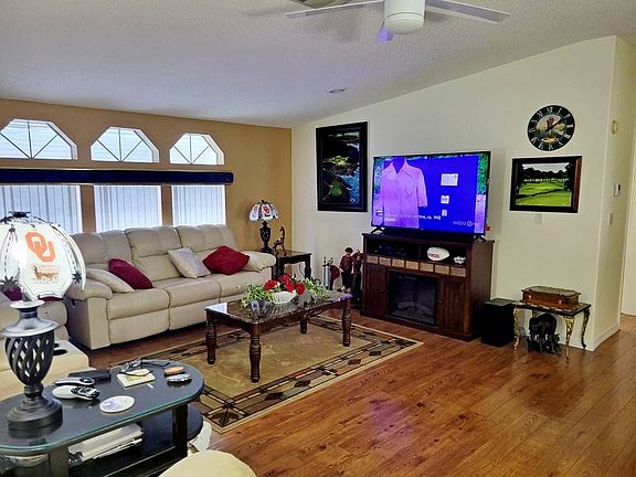 Homes in Four Lakes Golf & Country Club, a 55+ community, are on lot leased land. Owning the home, but not the land, you pay a monthly lot rent of $500 which gives you and your guest access to the amenities of the community........... This fully furnished home offers 1312 square feet of living space including 3 bedrooms and 2 baths. Because it is already turnkey (including a golf cart) you can bring a minimal amount of personal things with you to begin living the Florida dream! .......... The spacious and open living room and dining room will easily welcome friends and family who come to visit. Oohs and ahhs will be their reaction to your beautiful hardwood floors and exquisitely remodeled kitchen............ The main bedroom features an en suite bath with a soaker tub and shower. Oklahoma Fans will be delighted with the color choice, but if you want a more neutral color pallate, a can of paint can change the few crimson walls.......... The third bedroom will give you some options for an office, craft/hobby room, etc........... The furnished lanai with AC adds to entertainment space..................... Four Lakes Golf Club is an affordable, award-winning retirement community. It carries on that tradition with only the finest homes, amenities and service that is second to none. Anyone looking for an active retirement community in the central Florida area need look no further. Amenities include: 22,000 sq. ft. full service clubhouse; Four beautiful lakes with marina; Large heated swimming pool; Master whirlpool spa; 18 hole regulation golf course; Billiard and game room; Library & surround sound theater; 24 hour gated security; Exercise room with sauna; Fully equipped crafts room w/ kilns; Putting greens and pro-shop; and Access control gate with attendant. Pets under 40 lbs. allowed.