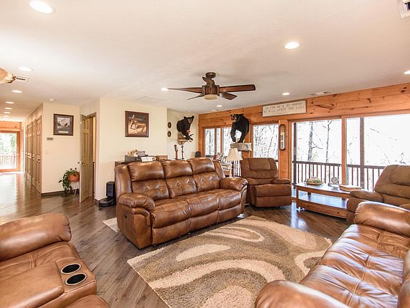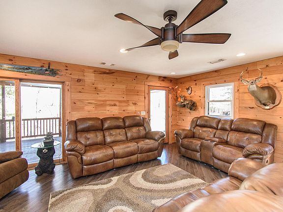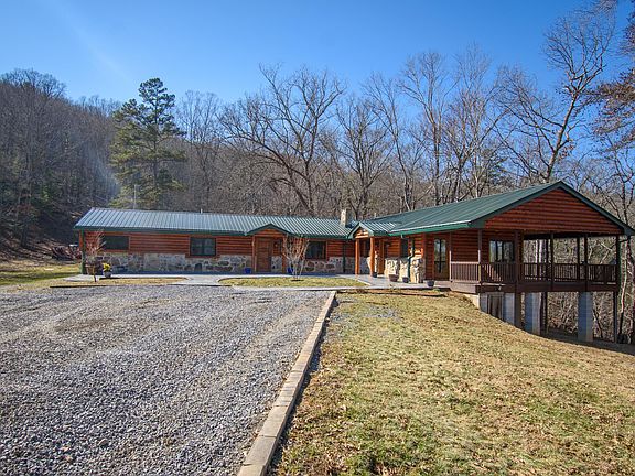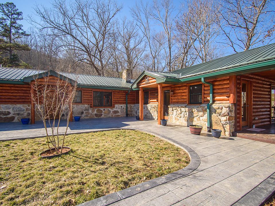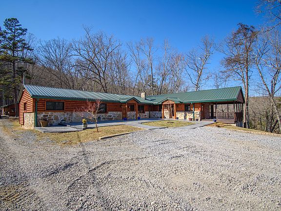 Enjoy the countryside in this beautiful rustic log cabin that sits on 94 acres! This home comes complete with lots of available outdoor seating and entertainment areas, both open and covered. The large windows bring in lots of light to the interior of the home putting the natural building materials of wood and stone on full display. Each room is uniquely laid out featuring both modern and natural elements that flow beautifully from one area to the next with plenty of space for entertaining your guests. The gorgeous views will take your breath away. With 2.5 miles of ATV trails around the perimeter of the property and throughout the wooded acres this is truly a nature lovers paradise!
